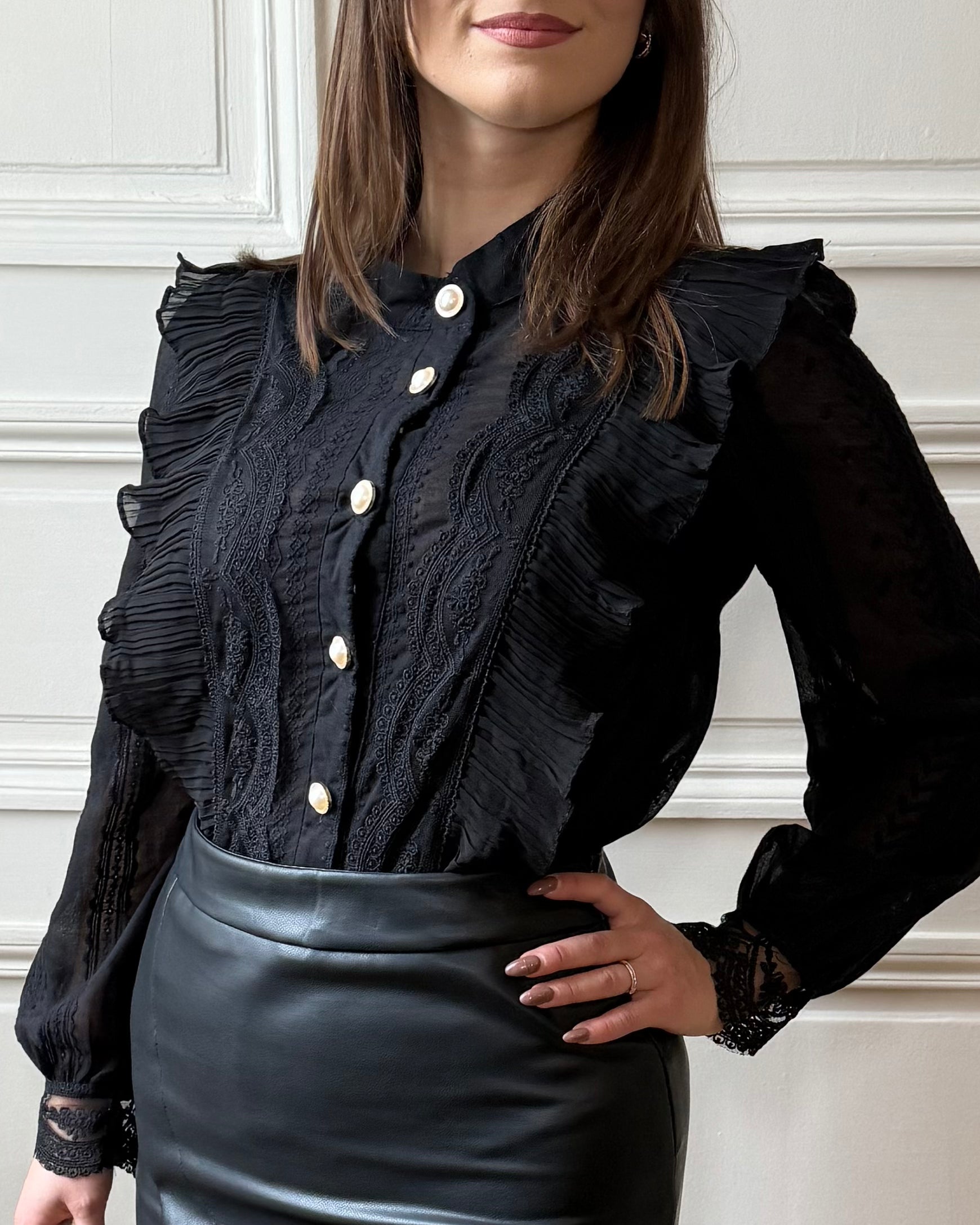 Cette chemise noire est une pièce élégante et féminine, parfaite pour apporter une touche raffinée à vos tenues. Les petits volants apportent du mouvement et de la légèreté, tandis que les boutons en perles ajoutent une note précieuse et délicate.