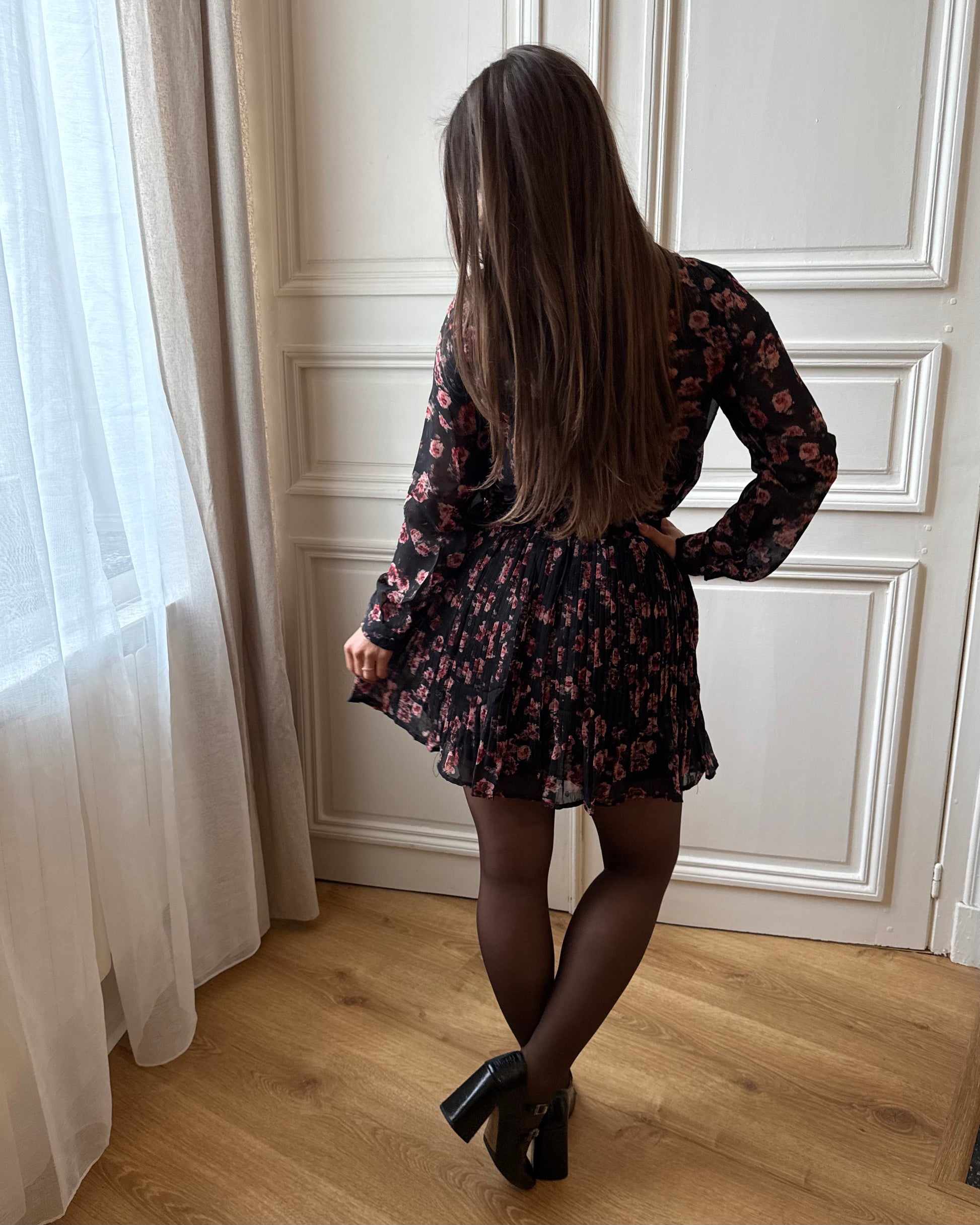 Ce chemisier allie romantisme et élégance. Son imprimé fleuri dans des tons rose se détache subtilement sur le fond noir, créant un contraste raffiné. Le décolleté en V apporte une touche flatteuse, tandis que la doublure en coton assure confort et praticité. Facile à associer, il se porte aussi bien avec un jeans, une jupe ou un pantalon élégant pour une allure plus habillée.