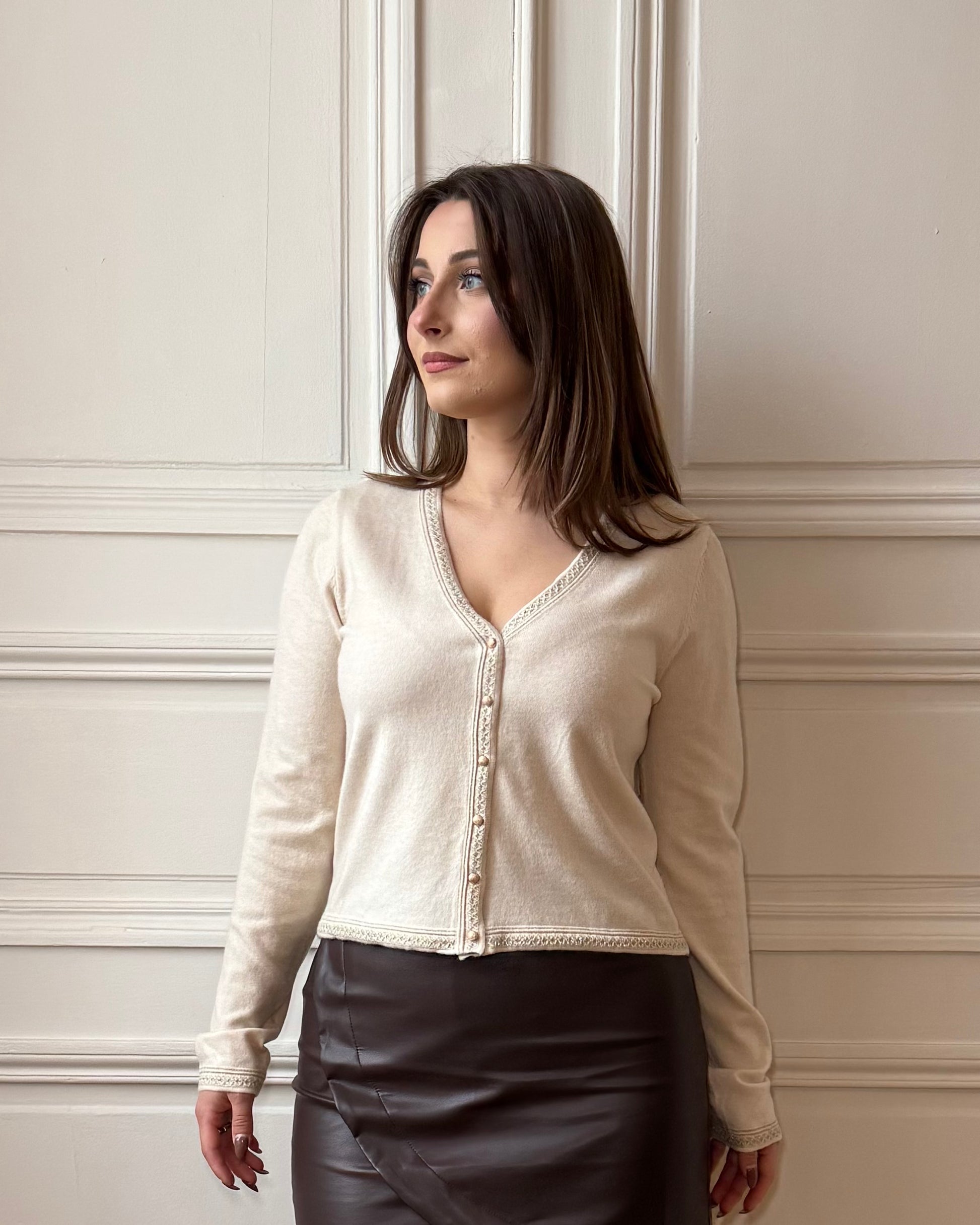Ses petits boutons dorés et son liseré lumineux ajoutent une touche raffinée, faisant de ce gilet une pièce idéale pour sublimer une tenue du quotidien ou apporter une note chic à un look plus habillé. Le cachemire présent dans sa maille lui donne un aspect premium et une texture que vous aurez plaisir à porter saison après saison.