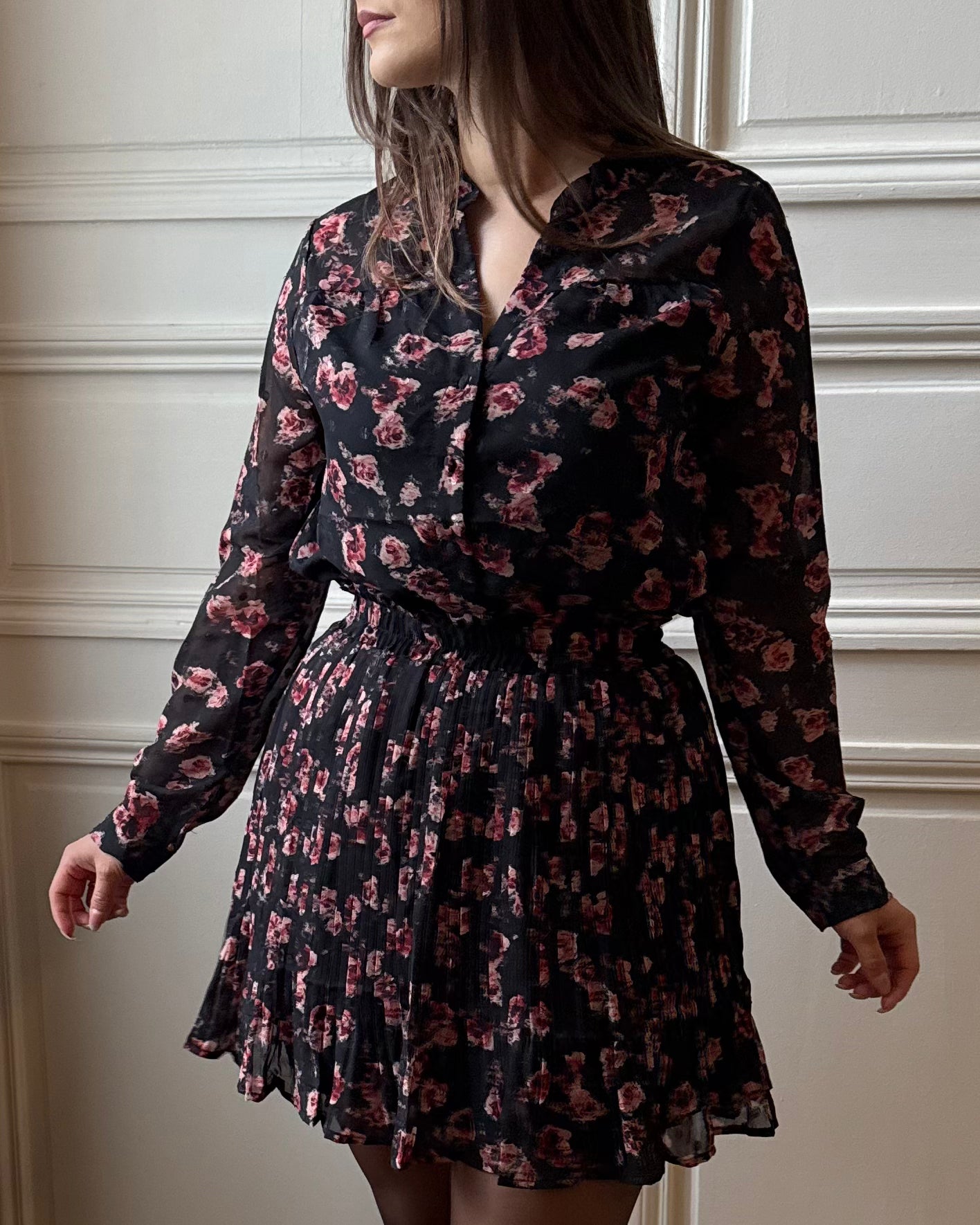 Féminine et légère, cette jupe plissée est un incontournable plein de charme. Son imprimé fleuri dans des nuances de rose contraste élégamment avec le fond noir, créant un look à la fois romantique et moderne. Sa coupe courte et fluide met les jambes en valeur, tandis que la doublure en coton assure confort au quotidien. Elle se porte aussi bien avec un pull col roulé et des bottines pour un look automnal chic qu’avec un top léger aux beaux jours.