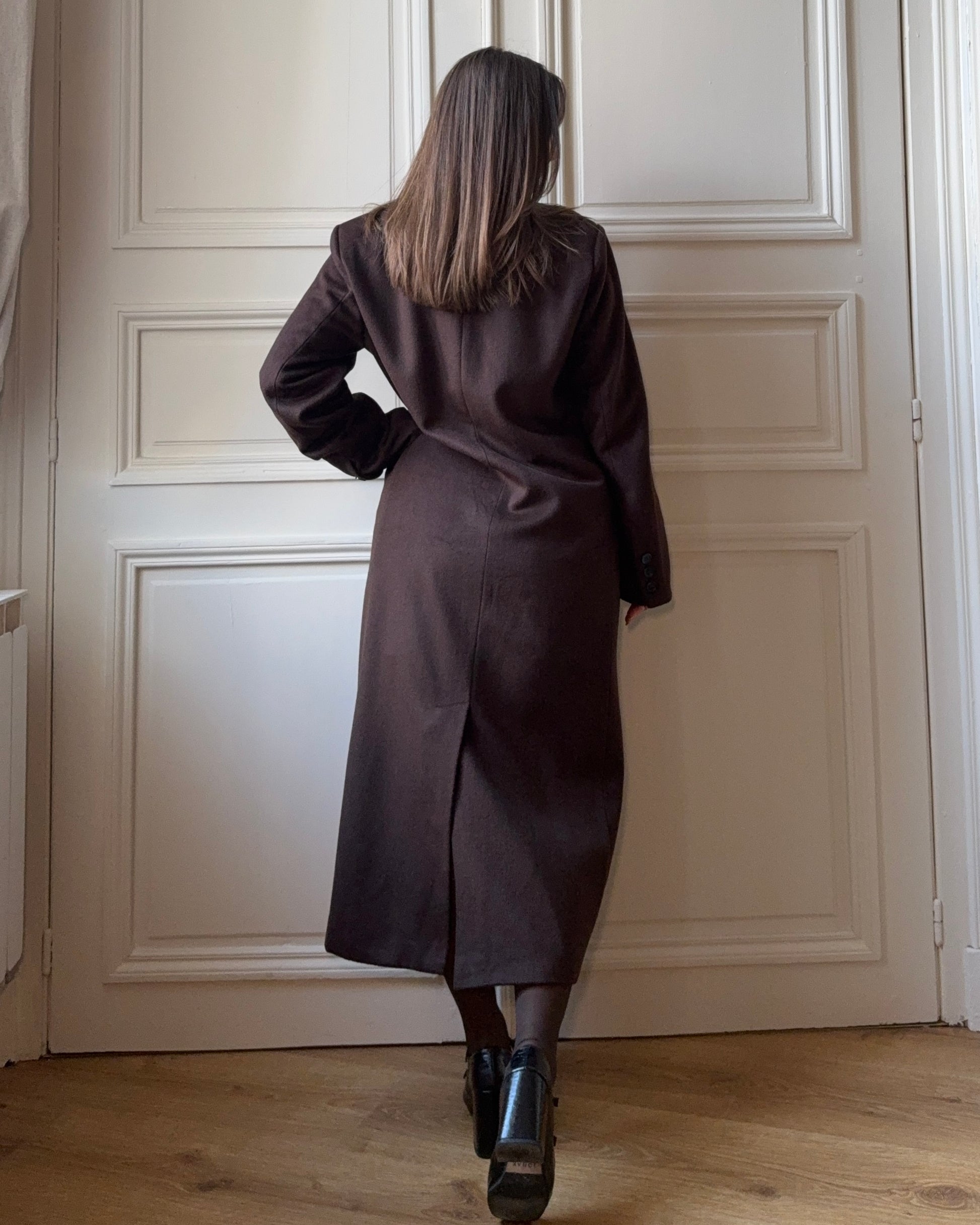 Ce manteau long marron se distingue par sa coupe masculine et ses épaules légèrement larges, offrant une silhouette moderne et structurée. Il se ferme à l’aide de boutons et apporte une allure élégante et affirmée, parfaite pour les tenues de ville ou les occasions plus habillées.