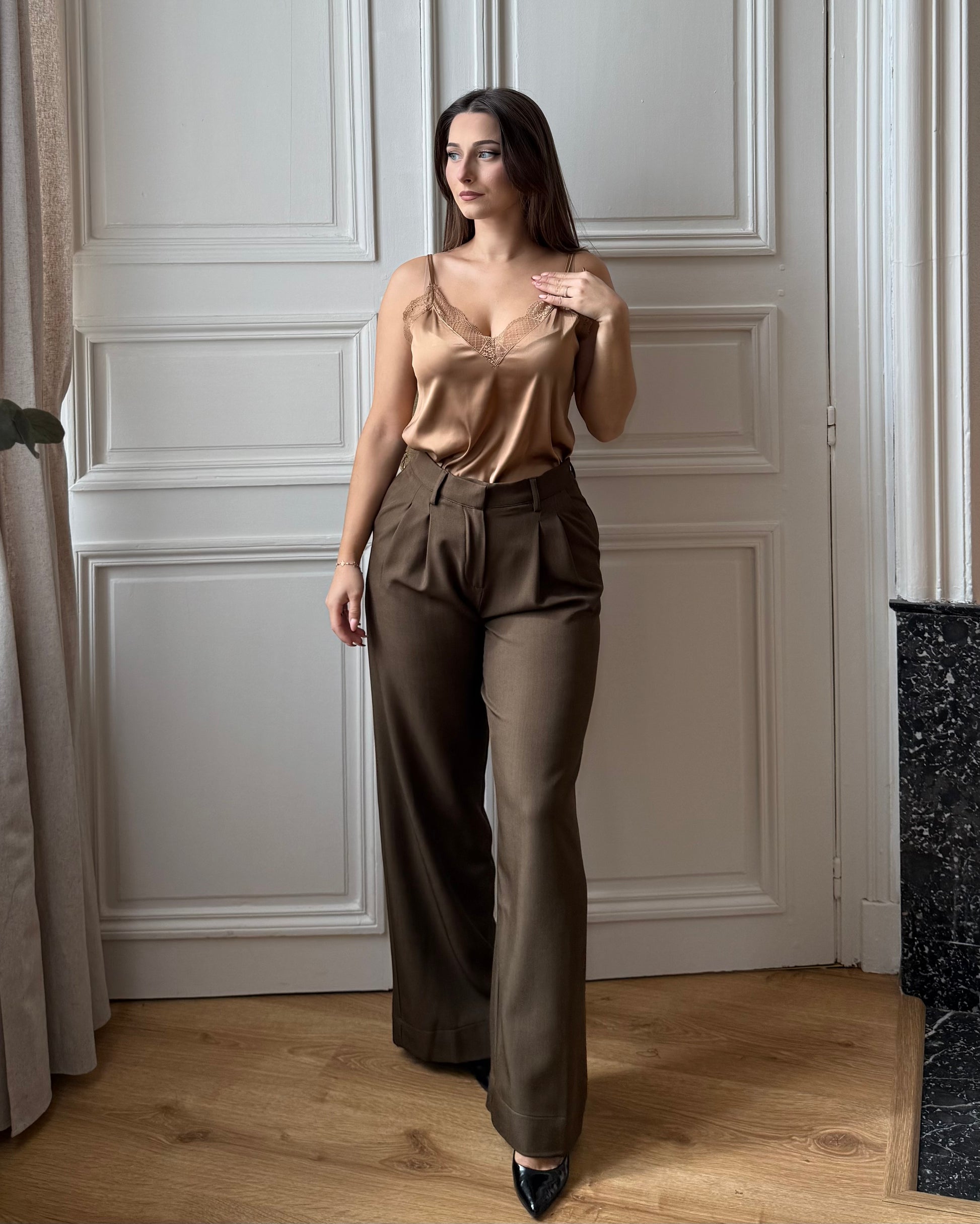 Ce pantalon droit à pinces allie élégance et confort pour un style raffiné au quotidien. Sa coupe droite classique met en valeur la silhouette tout en offrant une liberté de mouvement, et sa taille structurée souligne votre allure avec sophistication. Polyvalent, il se porte facilement avec une chemise, un top ou un pull, pour un look chic et moderne. Disponible en lie de vin et kaki, il s’adapte à toutes vos envies de style.