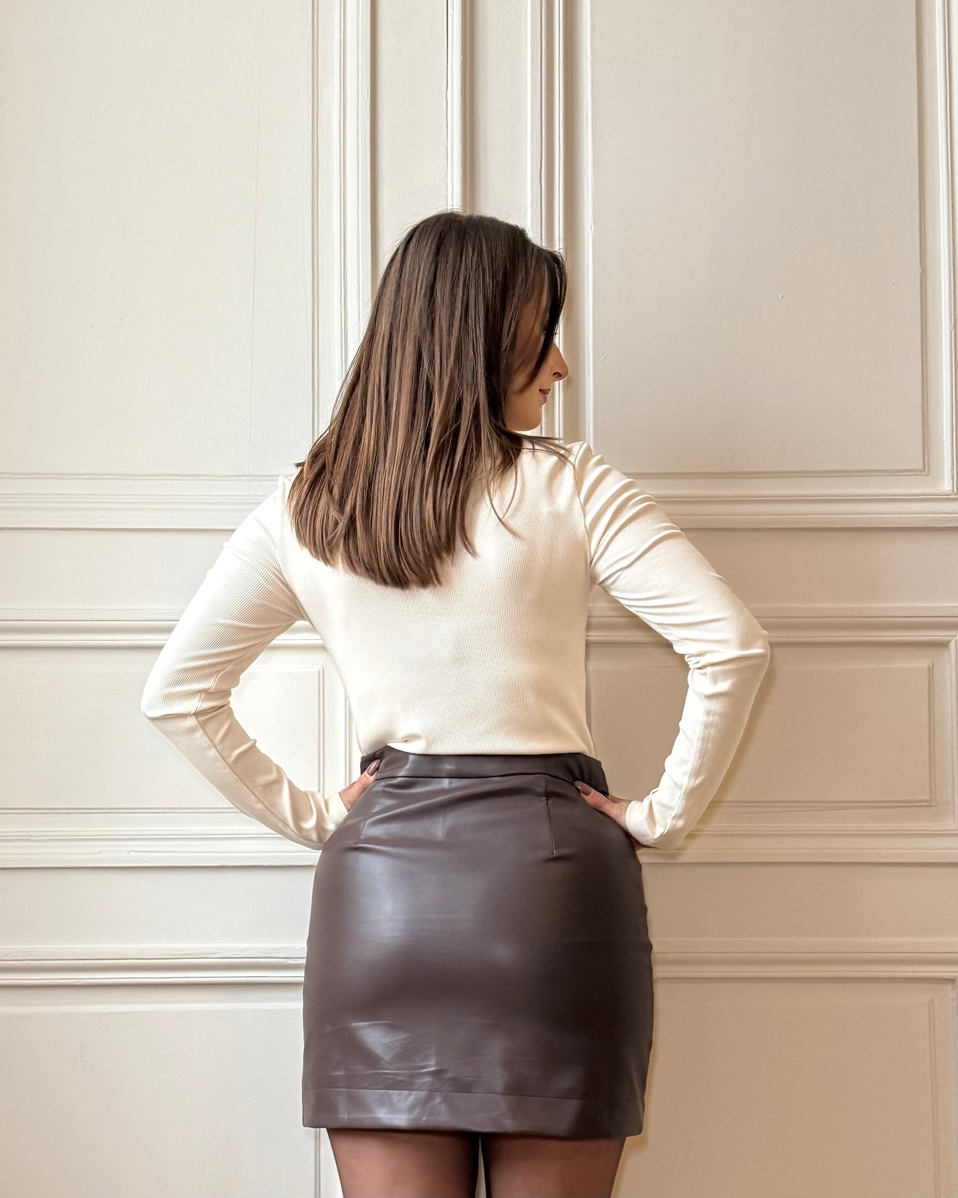 Sa matière douce et extensible assure un confort parfait tout au long de la journée. Il se porte aussi bien seul qu’en dessous d’un blazer ou d’un gilet pour un look simple et raffiné. Disponible en écru et en noir.